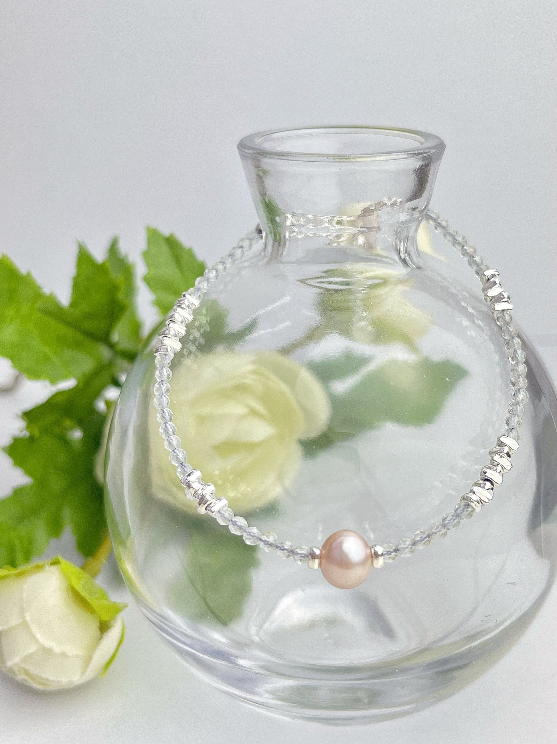 Akvamarin og perler- Håndlaget armbånd med karabinlås